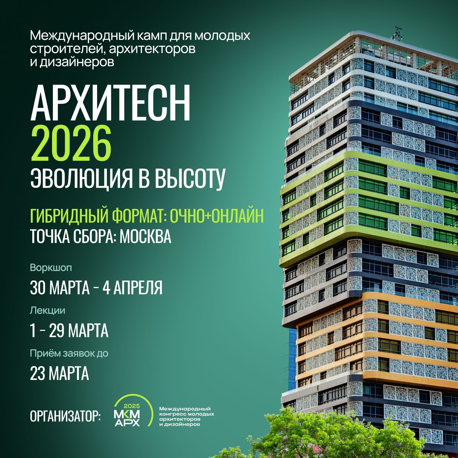 Справка. Международный конгресс молодых архитекторов и дизайнеров (МКМ-АРХ) — глобальная платформа, направленная на объединение молодых профессионалов из разных стран для обмена знаниями, опытом и инновационными идеями в сфере архитектуры, дизайна и устойчивого развития городов. Конгресс служит мостом между образованием, практикой и международным сотрудничеством, способствуя созданию нового поколения лидеров в области градостроительства.