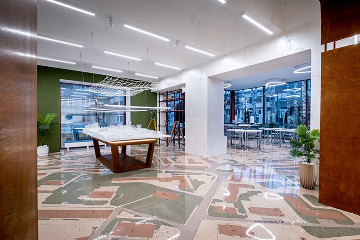 Напольное покрытие представляет собой план города, который можно использовать в качестве учебного материала. В его разработке принимал участие «Институт развития города». Осуществляется совместная научно-образовательная и партнерская работа с фирмой «Новые геодезические системы».